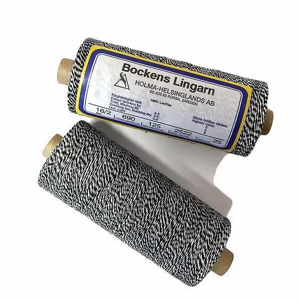 Bockens Aivina 16/2 on laadukas kerrattu pellavalanka kudontaan. Meleerattu mustavalkoinen lanka on kerrattu kahdesta säikeestä, joista toinen on musta ja toinen valkoinen.