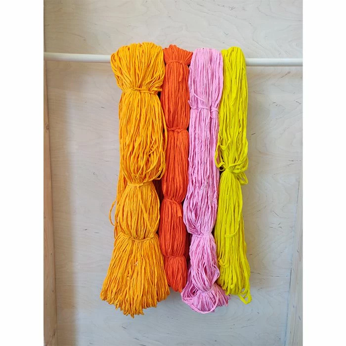 Huom. Lajitelmakuva on suuntaa antava. Lajitelman värit vaihtelevat ja poikkeavat aina jonkin verran kuvan viitteellisistä väreistä. Myös vyyhtien määrä vaihtelee neljästä kuuteen, joten kaikkia kuvan sävyjä ei välttämättä ole kaikissa lajitelmissa. Lajitelman vyyhdit eivät ole keskenään samanvärisiä, setti saattaa sisältää esim. useaa eri sinisen sävyä. Myöskään setit eivät ole keskenään yhtenäisiä, eli jos tilaat esimerkiksi kaksi SINISET-settiä, niiden sisältämä vyyhtilajitelma voi poiketa toisistaan. Puuvillatrikoon paksuus voi vaihdella ja se saattaa sisältää solmuja.