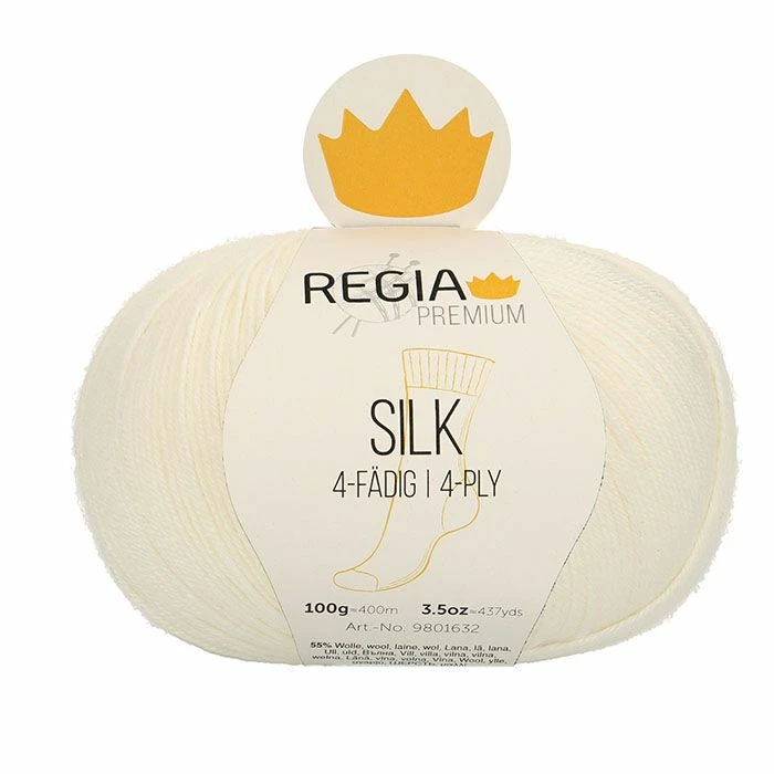 Regia Premium Silk on ylellinen sukkalanka merinovillaa, silkkiä ja polyamidia. Värjäämättömät silkkikuidut luovat lankaan hienoisen meleeratun sävyn. Pehmeä ja ihoa hellivä lanka sukkiin tai muihin neuletöihin.
