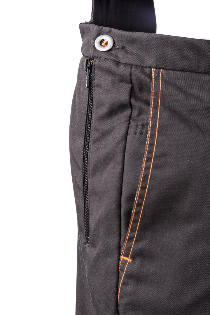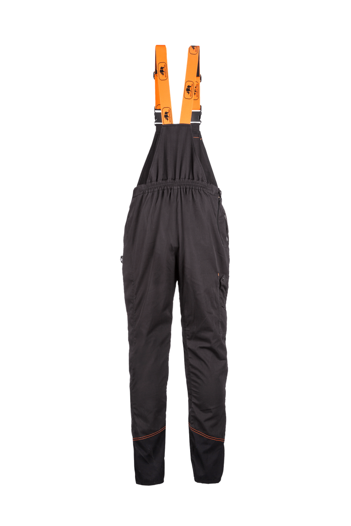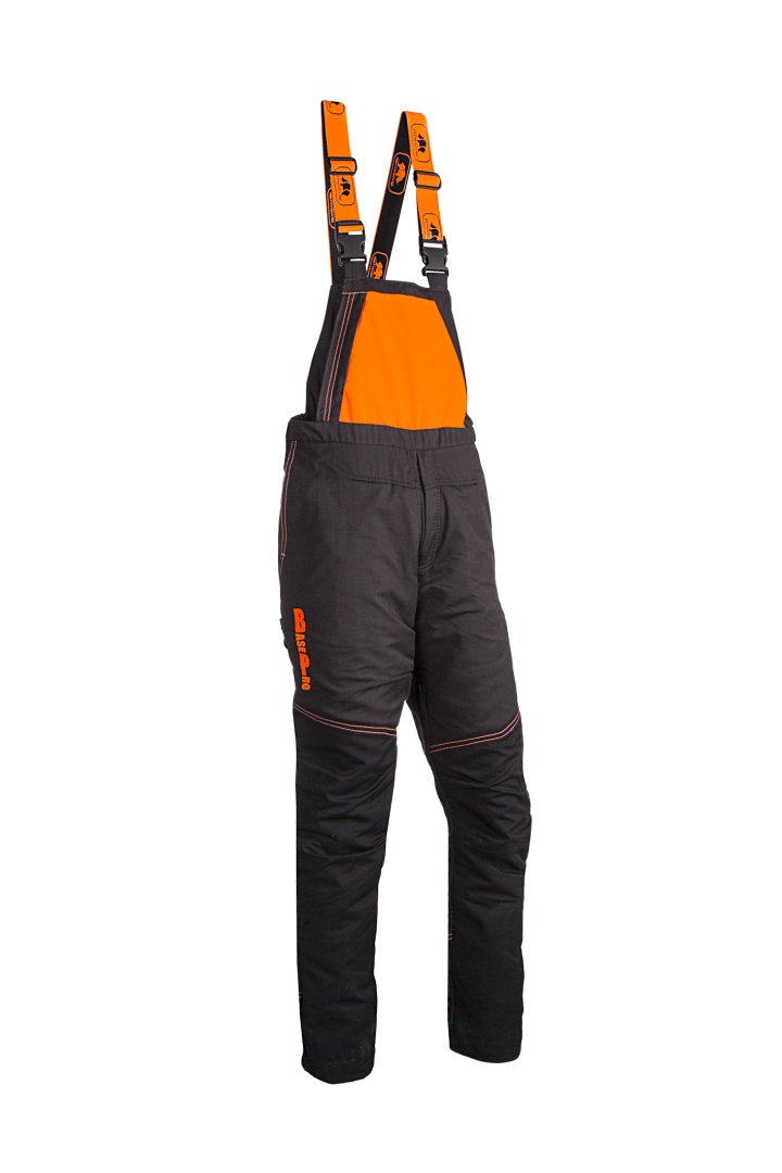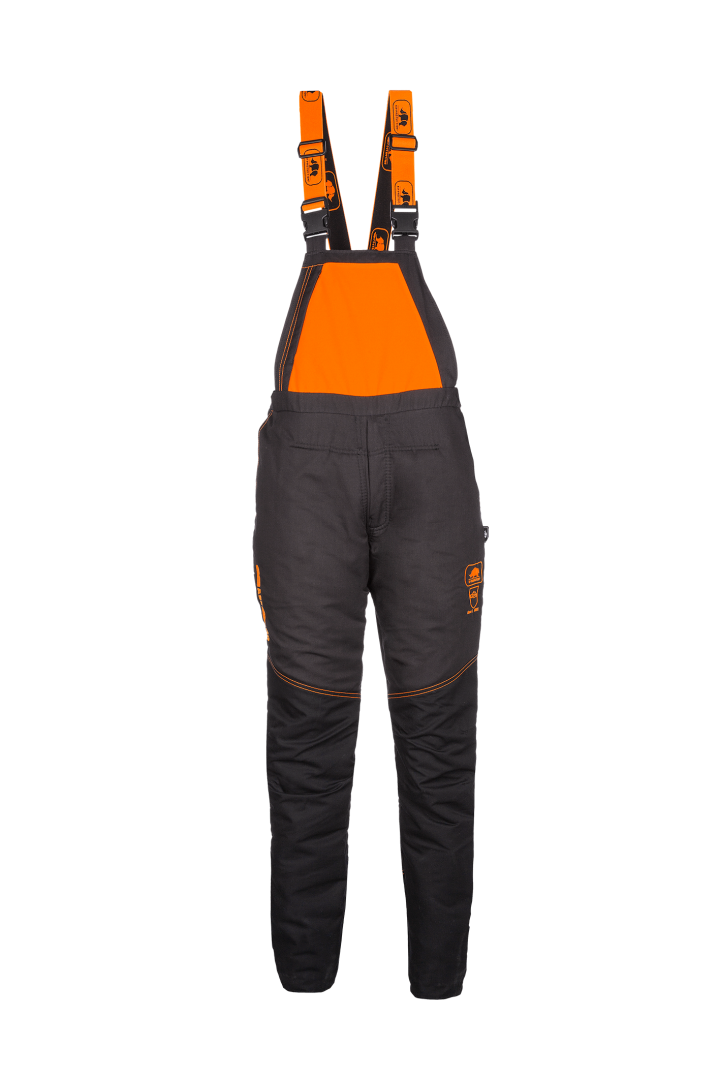 Luokka 1 tyyppi A mukainen viiltosuoja-avohaalari. Housuissa on tilava rintatasku, sivutaskut ja tukevat olkaimet. Elastinen vyötärö.